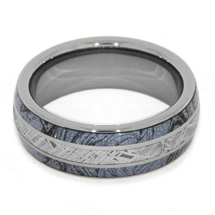 This terrific titanium ring has a mysterious aura about it. Mesmerizing meteorite is inlaid between two fantastic, composite mokume gane edges. The stunning cobaltium mokume and Gibeon meteorite sit in a bed of durable titanium. This ring would make an astonishing alternative wedding band.