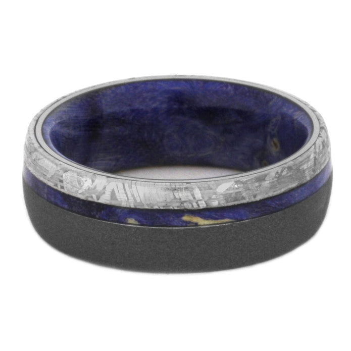 A starry night inspired ring made with a blue box elder burl. This meteorite wedding band has a sandblasted titanium finish on the outer shell and a smooth comfort fit wooden sleeve on the inside.