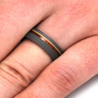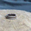 This titanium wedding band features unique craftsmanship and natural materials! This gorgeous, custom made wood wedding band features a sandblasted titanium shell and an exotic inner wood sleeve. The ironwood is beautifully complemented by the elegant 14k yellow gold pinstripe.