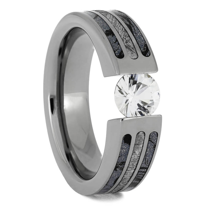 Coordinate with with your significant other with these mokume gane and meteorite wedding rings! Matching triple-inlay designs with meteorite and blue cobaltium mokume gane tie the designs of these rings together. The titanium engagement ring features a round-cut sapphire in a tension setting, which maximizes the gem's visibility. On the matching wedding band, rugged tungsten surrounds the meteorite and mokume inlays. Try something different with this space-inspired meteorite ring set!