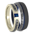 Enjoy this spectacular blue wedding ring set inspired by our wonderful starry galaxy. These meteorite rings are handmade with real Gibeon meteorite. The women’s blue sapphire engagement ring has partial inlays of meteorite sitting in a band of 14k white gold. The men’s titanium wedding band has a blue box elder burl sleeve and pinstripe. Adding to the masculinity of the ring is a sandblasted finish.