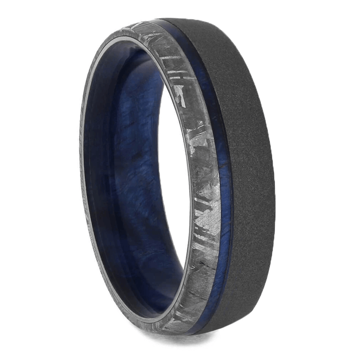Materials in Blue Wedding Ring Set, Meteorite Rings with Blue Box Elder Burl Wood