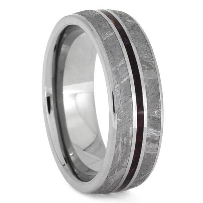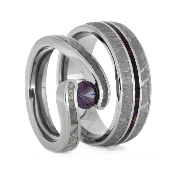 Accents of purple bring a splash of character to this galaxy-inspired Gibeon meteorite wedding ring set. Subtle glimmers of violet reflect off the facets of the engagement ring’s alexandrite center stone. Similarly, a purple box elder burl wood pinstripe gives a matching lavender decoration to the Gibeon meteorite wedding band. Symbolize your unity with this matching set of space rings!