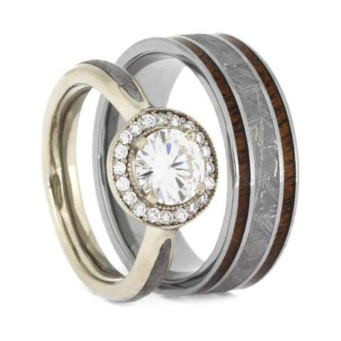 Gibeon Meteorite Wedding Ring Set, White Gold Halo Engagement Ring and Tulipwood Wedding Band