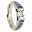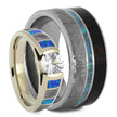 This unique opal wedding ring set comes with a round cut diamond engagement ring for her and a men’s meteorite wedding band. The women’s white gold ring has a round cathedral shape with partial inlays of meteorite and synthetic opal. The men’s ring is made in titanium and inlaid with meteorite and dinosaur bone on each side with an opal stripe in the center.