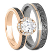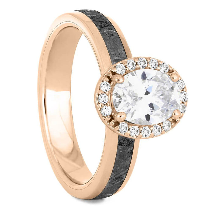 This unique meteorite wedding ring set features two rings with coordinating meteorite. Hers is a oval halo moissanite engagement ring and the band for him features a coordinating pinstripe of 14k rose gold