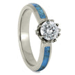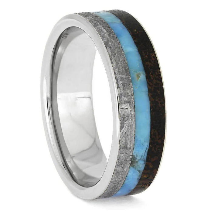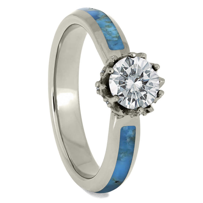 Celebrate your individuality while symbolizing your union with this turquoise wedding ring set featuring matching inlays. A lustrous moissanite center stone glistens in the engagement ring’s ornate lotus setting, which is adorned with 14 diamond side stones. A partial turquoise inlay adds a splash of color to the elegant floral setting. The men’s wedding band is also inlaid with turquoise, along with exotic bands of Gibeon meteorite and dinosaur bone. The engagement ring is made with 14k white gold, and the men’s wedding ring is set in durable, polished titanium.