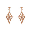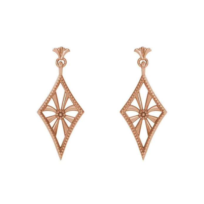 These vintage looking dangle earrings are handcrafted and unique. They feature a kite shape accented with milgrain and floral focal point in the center. Available in 14k rose gold.