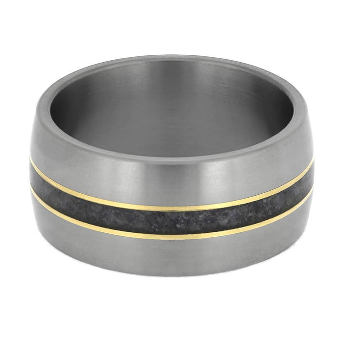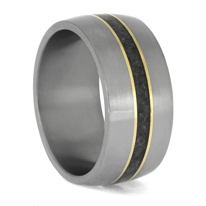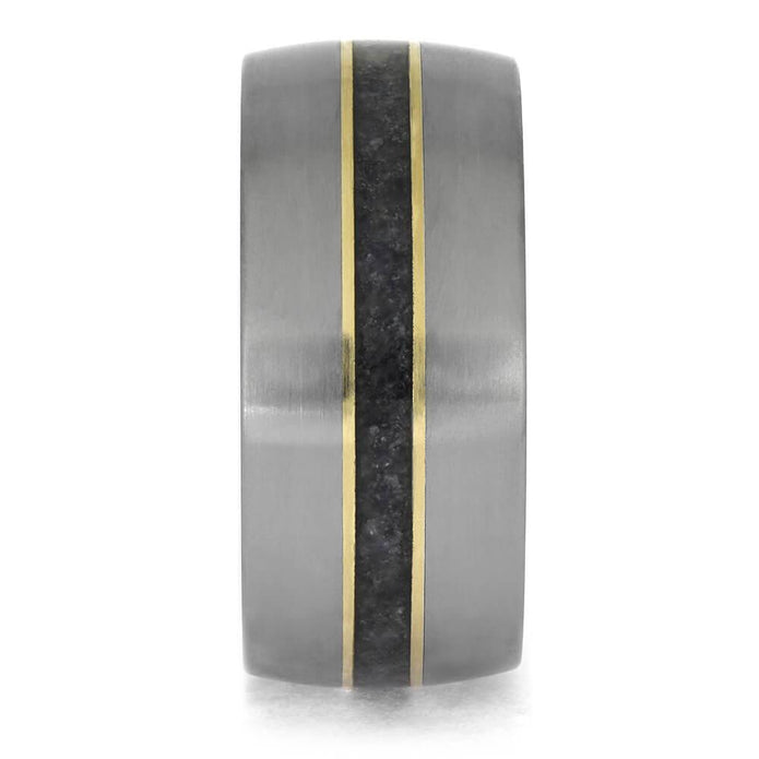 Crafted with both style and durability in mind, this men's wedding band features a sleek matte titanium exterior accented with elegant 14k yellow gold pinstripes. Adorned with crushed sapphires, the stunning blue birthstone for September, this band adds a vibrant pop of color to the classic design. Ideal for the traditional yet modern groom.