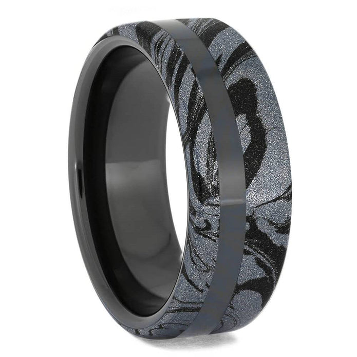 The unique light pattern of the colorful, composite mokume gane mates well with the masculine, polished black ceramic in this wedding band. With the random pattern in mokume, no two pieces will ever be the same.