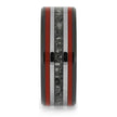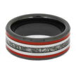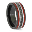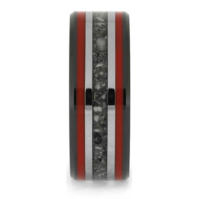 This expertly crafted black ceramic ring offers a unique way to honor the memory of a beloved pet, family member, or friend. Its handmade design features three distinct inlays, separated by two titanium pinstripes, with red enamel on the outer inlays and ashes or cremains on the center inlay.