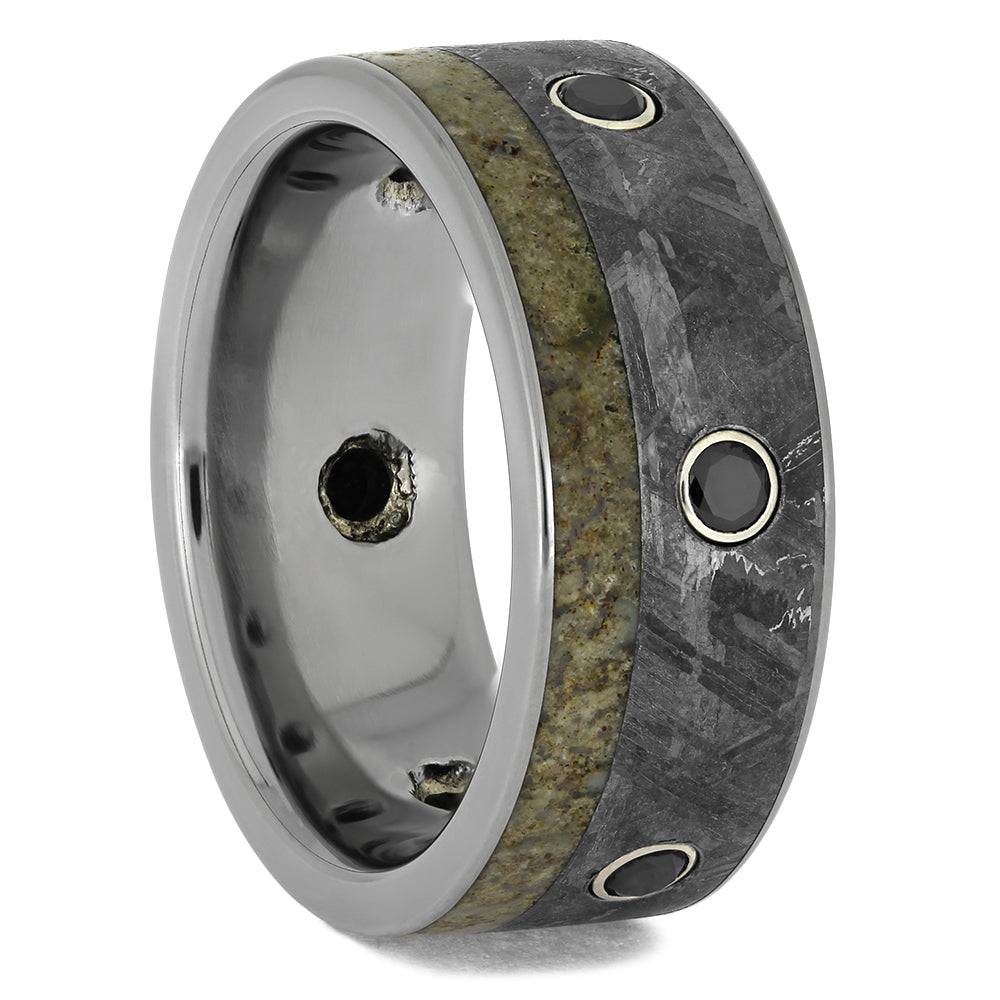 Black Diamond Wedding Band with Meteorite and Dinosaur Bone