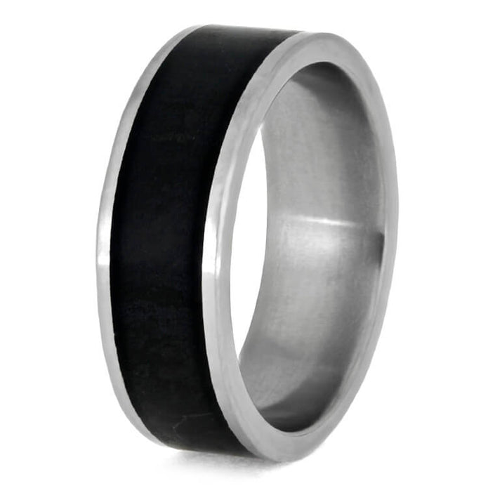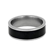 Smooth, matte titanium encapsulates this black jade wedding band for a sleek, masculine style. The subtle patterns in the black jade give a splash of visual interest to the sleek stone. This stone jewelry is a great wedding band or friendship ring for both formal and casual occasions.