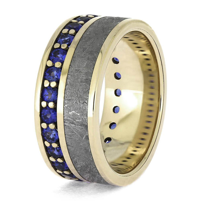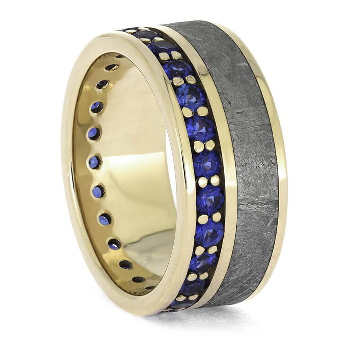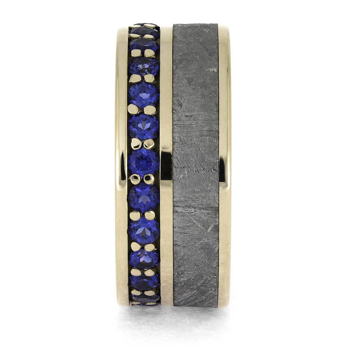 Stunning blue sapphires and authentic Gibeon meteorite combine on this unique eternity wedding band from Jewelry by Johan. The glistening blue birthstones are set in polished white gold in a timeless, classic style. No two etched meteorites are the same, so you know your ring will be a special, one-of-a-kind heirloom.