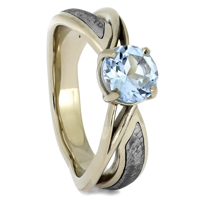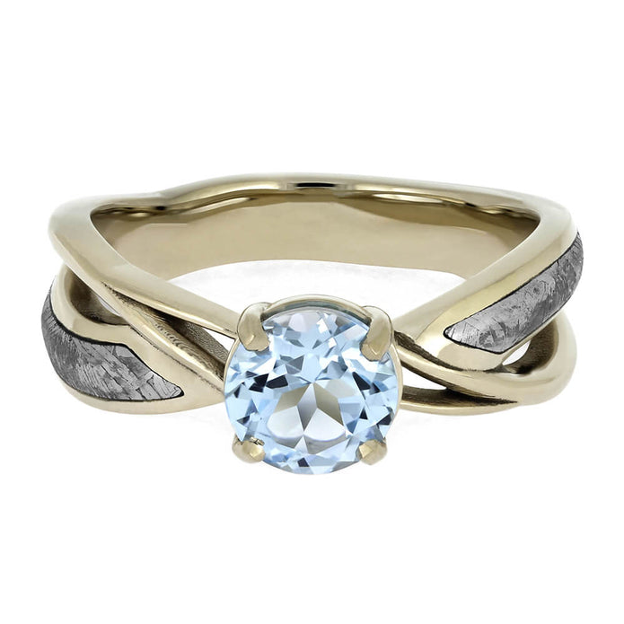 Pop the question with this elegant blue topaz solitaire! Twin bands of 14k white gold and Gibeon meteorite twist around the shank, meeting at brilliant blue center stone. This alternative engagement ring is perfect for stargazers and space enthusiasts!