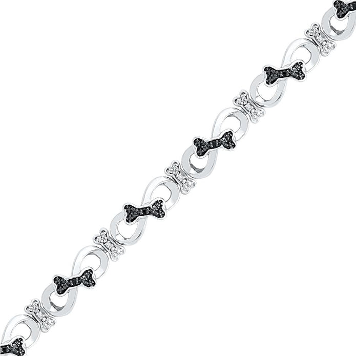 Glistening in a high polished sterling silver or gold, this white and black diamond bracelet is quirky and cute. This bracelet features alternating black and white diamonds that create large and small bow ties, which are connected with symbolic infinity symbols. Shining with 0.075 ct. t.w. of diamonds, this sterling silver bow tie infinity bracelet is a great look for any occasion.