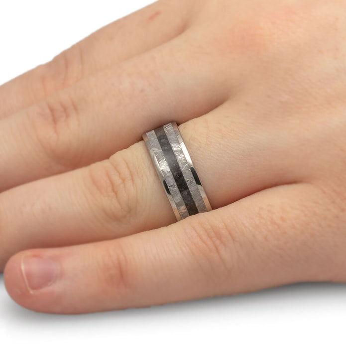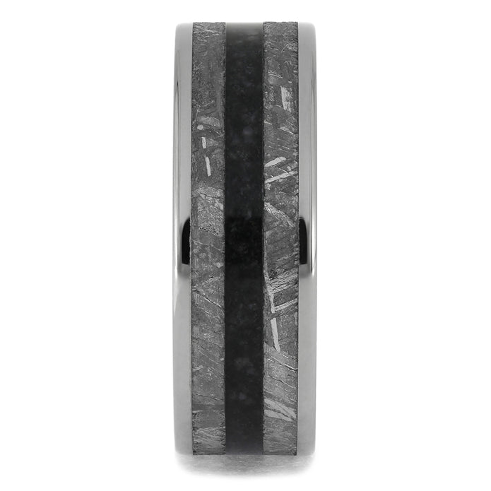 Crushed onyx is one of the unique materials featured in this tungsten men's wedding band. Gibeon meteorite is the other, which frames the dark crushed gemstone inlay that runs up the center of the ring.