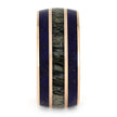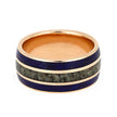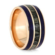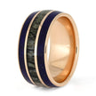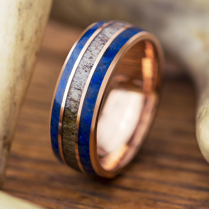 A unique combo of materials are inlaid in this wonderful deer antler wedding band. The admirable lapis lazuli stone is surrounding a center inlay of naturally shed deer antler. Separating each material is a thin stripe of 14k rose gold matching the comfort fit sleeve. Lapis lazuli is a semi-precious stone prized for its beauty.