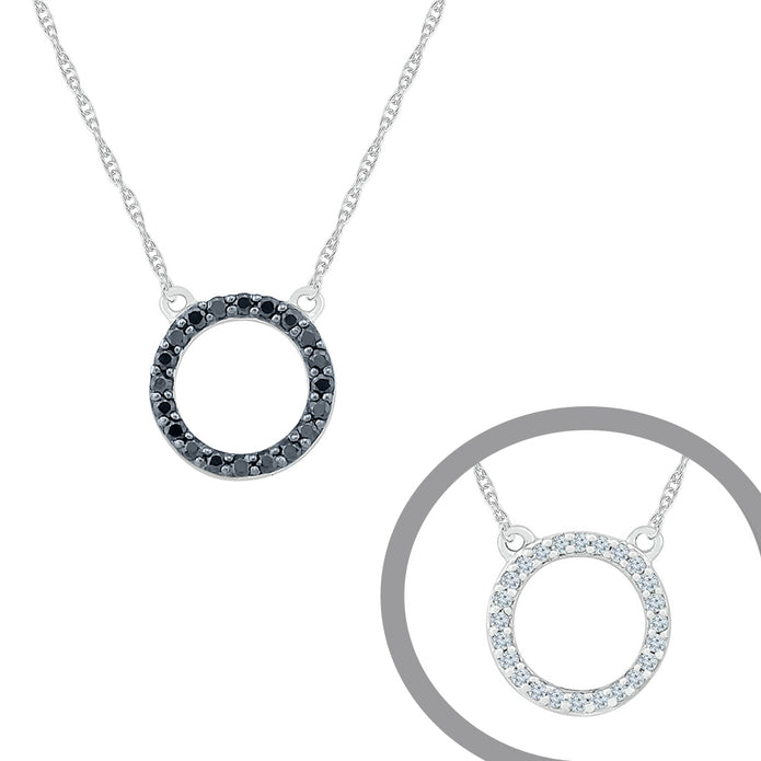 This amazing, reversible diamond necklace is actually TWO necklaces in one! On one side, it features an endless circle of white diamonds. Flip it over and it has black diamonds. Expertly crafted in sterling silver or gold on an 18" rope chain.