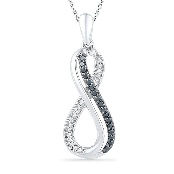 Crafted in your choice of sterling silver or gold, this black diamond pendant features a gorgeous sentiment to everlasting love. Classic white diamonds unite with alluring black diamonds to decorate an open infinity symbol, a modern take on a classic design. This black diamond pendant features 1/6 ct. t.w. and is displayed on a beautiful rope chain.