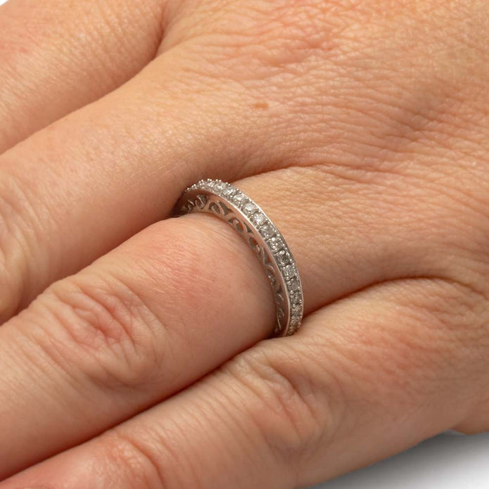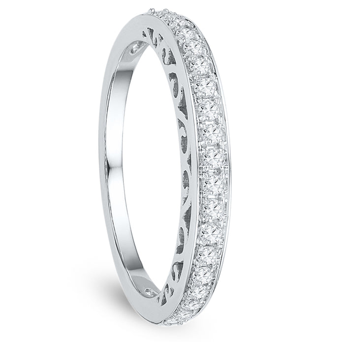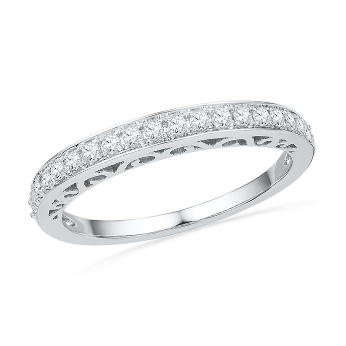 Simple and classy, this women's wedding band can be worn as a standalone wedding band, or be worn as an accent band to your existing wedding ring. The wedding band features 1/4 carat total weight of diamonds along with a high-polished shine band. The ring is available in sterling silver or white gold.