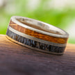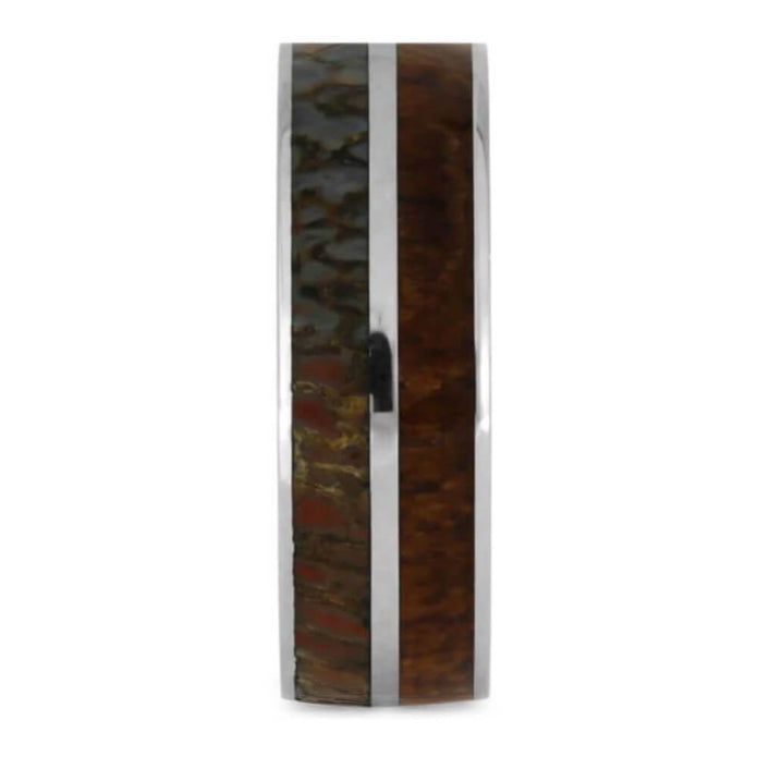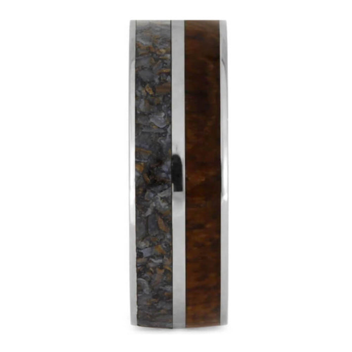 Polished titanium protects the exotic materials in this dinosaur bone ring featuring teak wood. The intricate patterns in the fossilized dinosaur bone complement the warm wood grain in the neighboring teak inlay. This wedding band is an excellent choice for any nature lover!