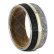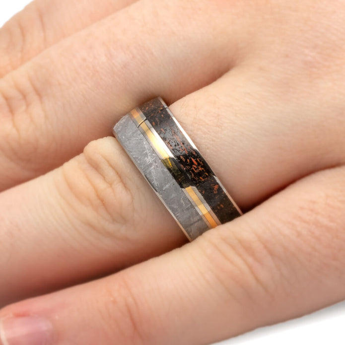 In this wide men's wedding band, a whiskey barrel oak wood is used for a comfort fit sleeve. This titanium ring is equipped with some of the most unique materials you could find. Between the meteorite and dinosaur bone are pinstripes of titanium and 14k yellow gold, adding a sleek and shiny touch to this men’s wedding band.