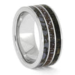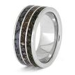 Three distinct inlays of dinosaur bone decorate this platinum wedding band for the ultimate science-inspired wedding band. This custom ring is handmade with solid  platinum and has three unique fossil inlays that you get to choose yourself! Order this wedding band for the special geologist or dinosaur geek in your life for a ring design that has stood the test of time.