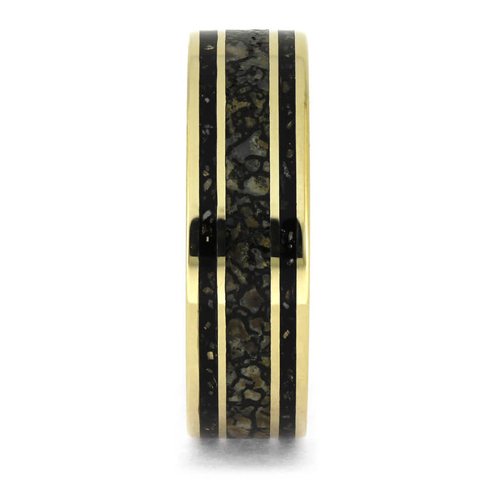 This men's wedding band pairs genuine, fossilized dinosaur bone and black stardust, which is a combination of authentic meteorite flakes in colored enamel, and crafted in 14k yellow gold. The mixture of unique colors and materials let this dinosaur bone wedding band bring something unique to your look.