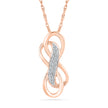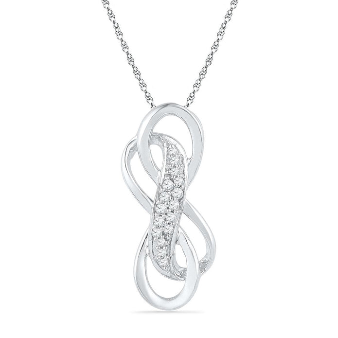 Crafted in your choice of sterling silver or gold, this double infinity necklace is full of symbolism and elegance. Two open shaped infinity symbols are intertwined together and decorated with 1/10 ct. t.w. of diamonds. This pendant is displayed on a high polished rope chain.