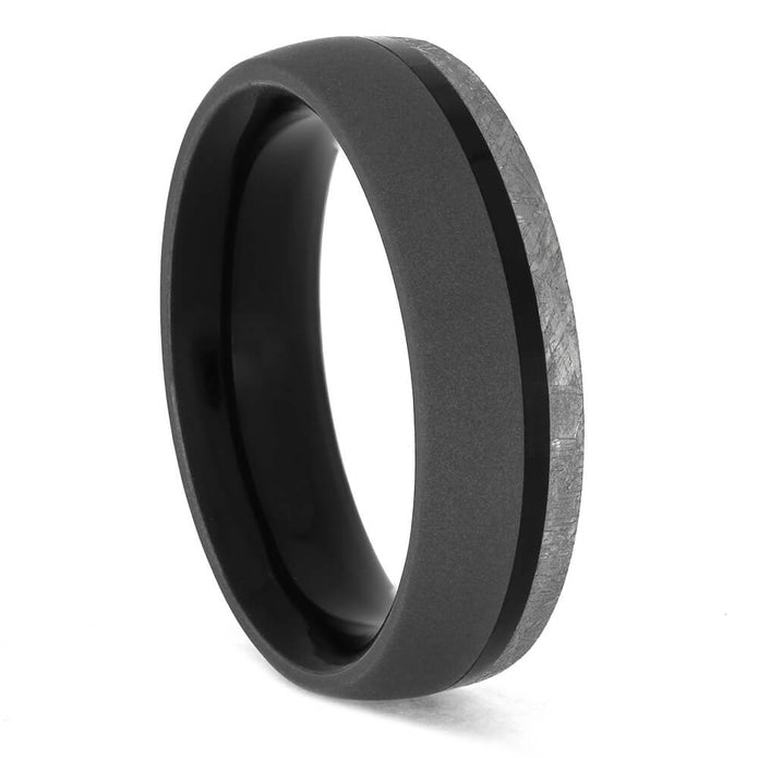 This elegant, dark, and mysterious ring is perfect for the special man in your life. With its comfortable wooden sleeve, shock of metallic meteorite, and subtle grace of sandblasted titanium, it is sure to be a favorite of his for many years to come.
