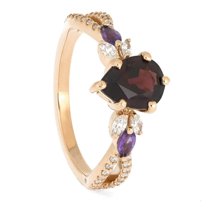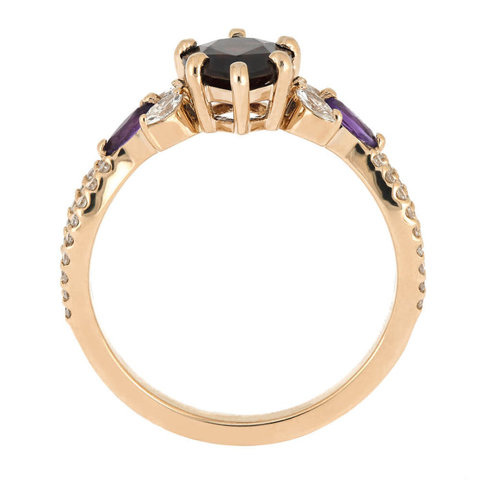 This beautiful garnet engagement ring showcases exquisite craftsmanship. Handmade in 14k rose gold, its intricate band has an elegant twisted design and is embellished with sparkling diamonds and amethyst stones.