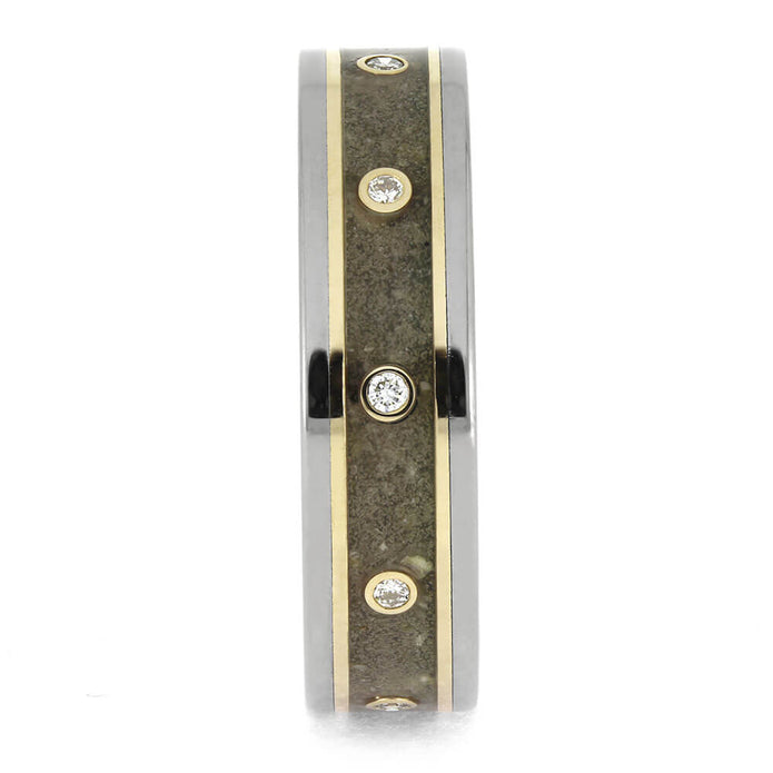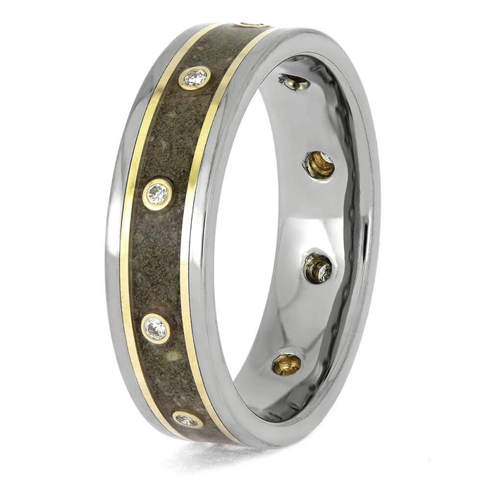 Honor the memory of a dear friend or beloved pet with this artisanal memorial ring. Made with cremated remains and embellished with gleaming gold pinstripes and sparkling diamonds, it serves as a sophisticated token of remembrance for both men and women.