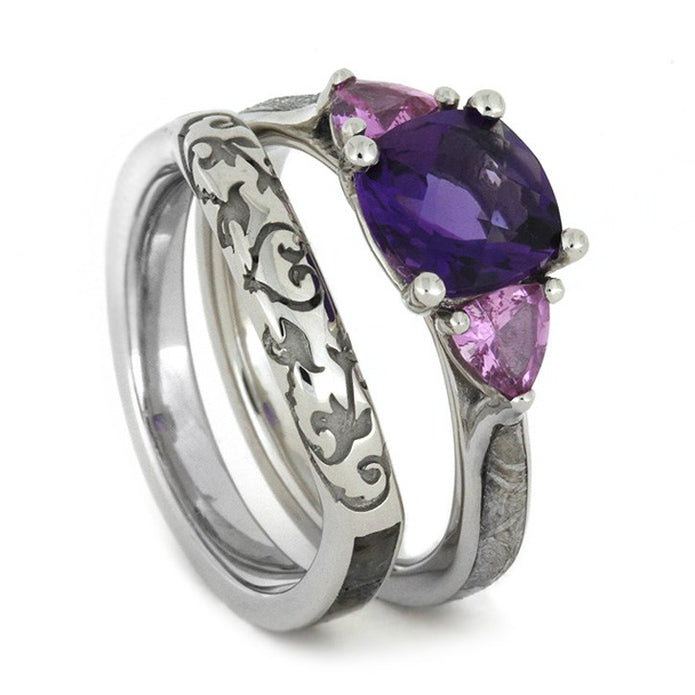 This 14k white gold wedding ring set holds a pure beauty that is unmatched. The sheer uniqueness of the meteorite engagement ring and dinosaur bone wedding band knows no contender. The cushion-cut purple amethyst, and two heart shaped pink sapphires, are a stunning combination, perfectly paralleling the custom designed engraving on the white gold wedding band. Give her the extraordinary wedding ring pair she's always deserved.