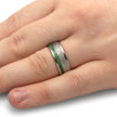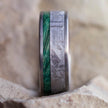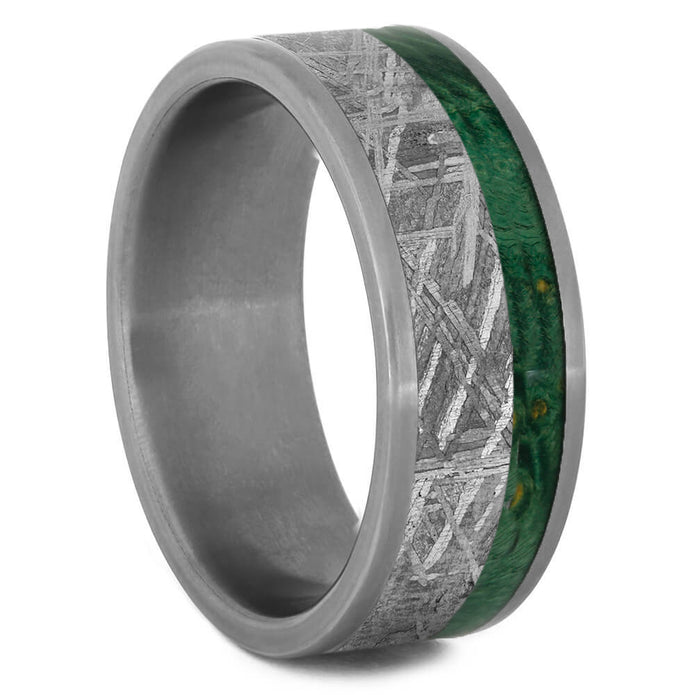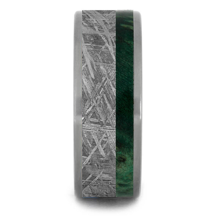 Featuring exotic materials from both Earth and space, this green wood wedding band is a stylish example of natural jewelry. Gibeon meteorite fills the center of the band with its jagged and intricate patterns. The masculine titanium sleeve provides structure and durability while accenting the natural inlays. A thin stripe of green box elder burl wood adds a splash of color to this space jewelry.