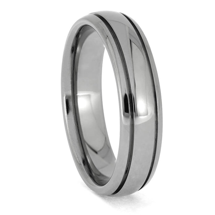 Durable and stylish, this grooved titanium wedding band is crafted from titanium and features grooved pinstripes. Perfect for the special day, this wedding band is comfortable and sleek.