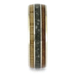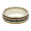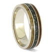 Expertly crafted with polished 14k white gold, this colorful wedding band features stunning oak and madrone wood accents and a vibrant green jade centerpiece. The opulent gold borders and pinstripes add a lavish touch to this nature-inspired creation, making it a truly exquisite piece.
