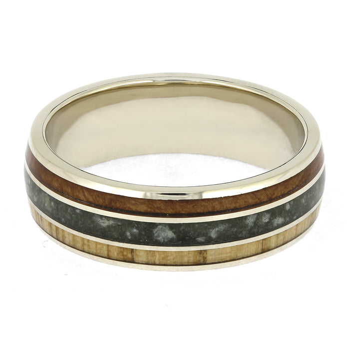Materials in Jade Ring with Oak and Madrone Wood in White Gold