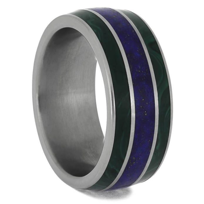 This amazing and unique men's wedding band features three symmetrical inlays. Featured in the center, an inlay of beautiful, genuine blue lapis lazuli. The two outer inlays both showcase malachite. This blue and green ring is bold, colorful and far from boring.