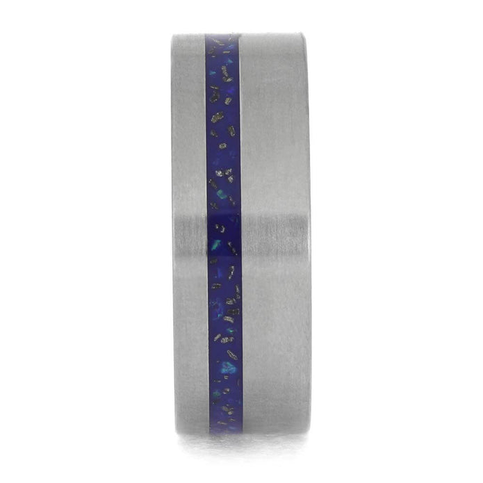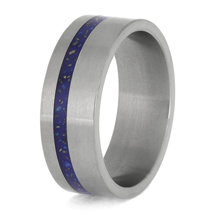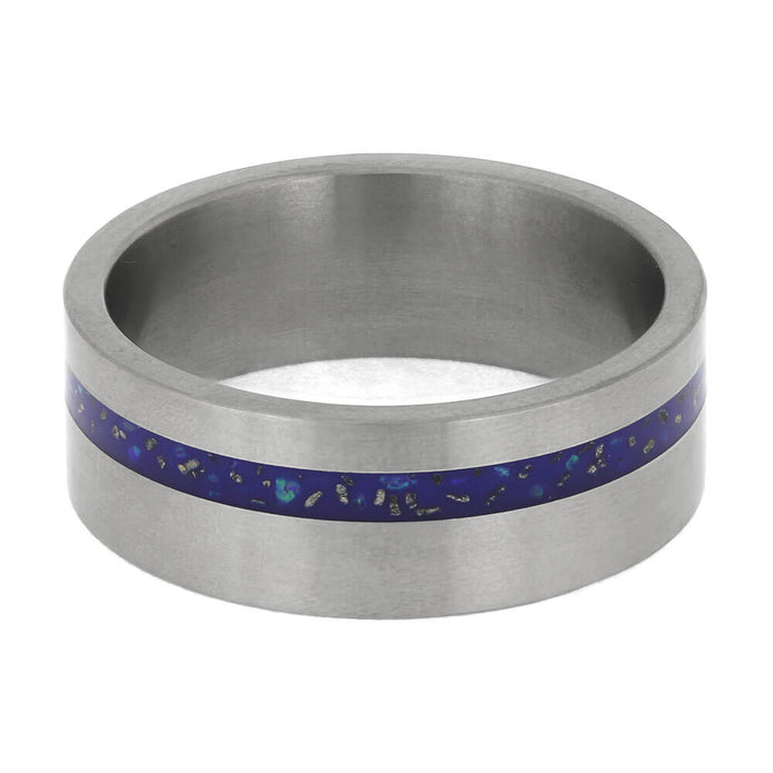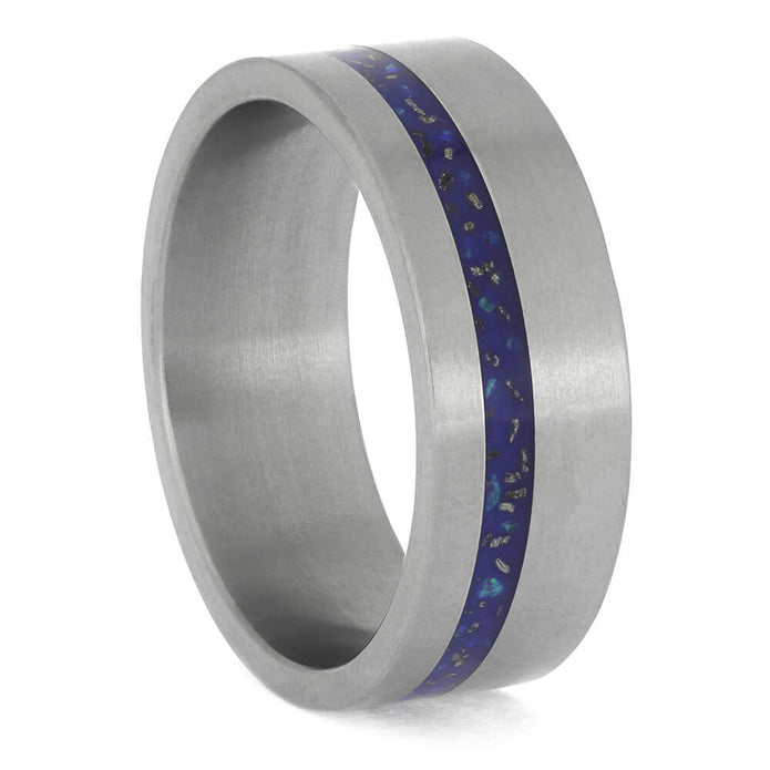 This titanium ring for men features blue opal Stardust, a stunning combination of meteorite shavings and synthetic opal shards, set against a blue enamel background. Ideal for astronomy enthusiasts and those who love to gaze at the stars!