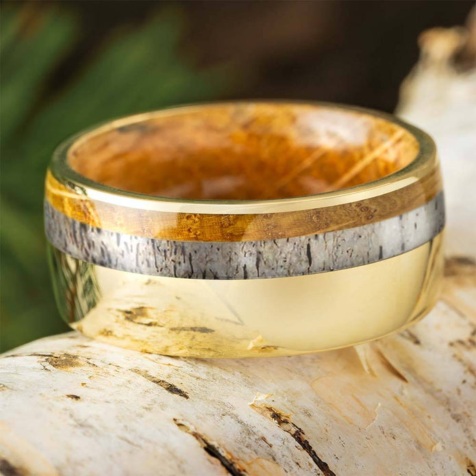 Experience the perfect combination of organic elements and elegant design with this men's wedding band, featuring a 14k gold band, deer antler inlay, and whiskey barrel oak sleeve. Cheers to a unique and inspiring ring that truly stands out.
