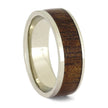 Mesquite wood is the special species inlaid in this intriguing 14k white gold ring. Gleaming white gold complements the captivating and natural wood grain patterns, giving this wood ring a beautiful look.