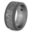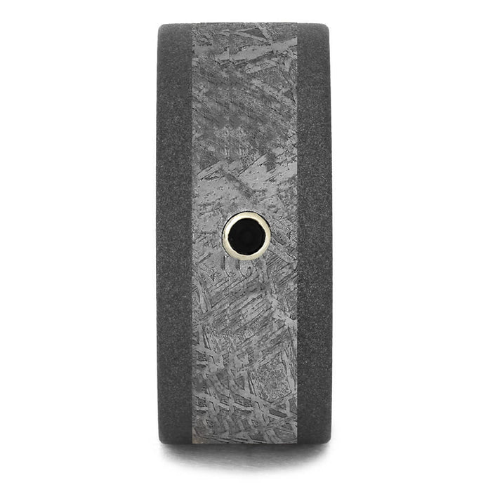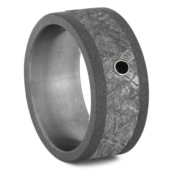 Gibeon meteorite and black diamonds are a seemingly perfect match. Both extraordinarily unique elements to set your men's wedding band a part from the rest. The round black diamond sits in a sterling silver bezel. This black diamond ring with sandblasted titanium interior provides a masculine shade of ruggedness.