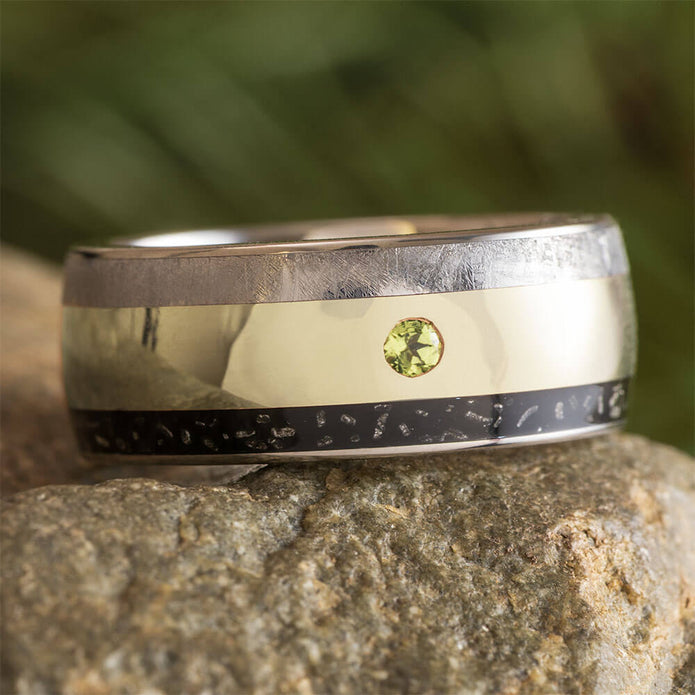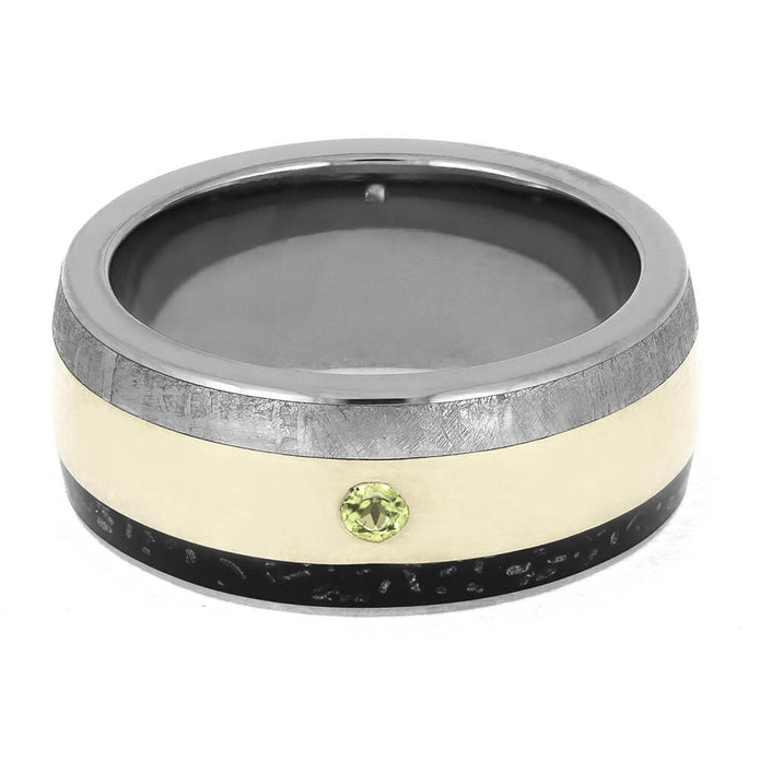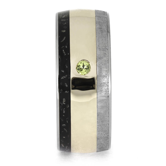 Meteorite Wedding Band for Men with Peridot and White Gold