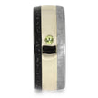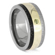 Experience an elegant and mysterious aesthetic with this wedding band featuring meteorite and white gold. A single peridot stone brings a touch of color to the center stripe of white gold, while the Stardust and Gibeon meteorite inlays offer a unique and celestial touch to the design.
