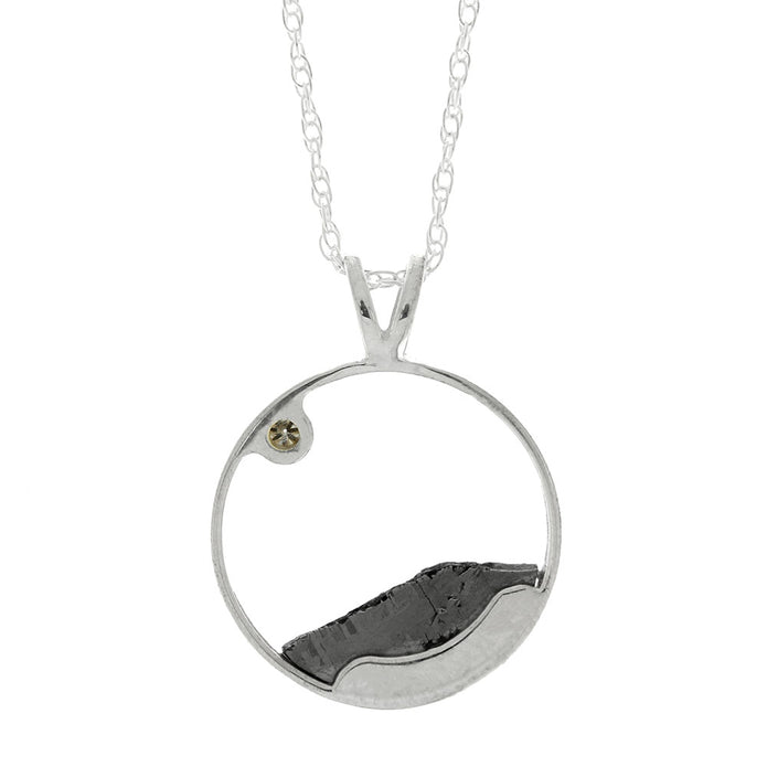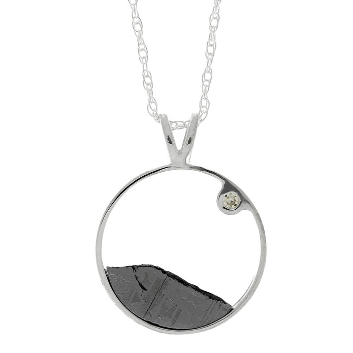 Keep real meteorite close to your heart with this handmade meteorite necklace! Crafted in the USA, this unique celestial jewelry is made from solid .925 sterling silver and features a flush-set moissanite stone. This small necklace is the perfect gift for astronomers, science enthusiasts, and stargazers.