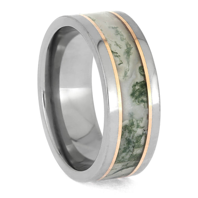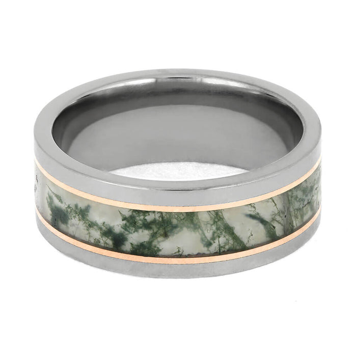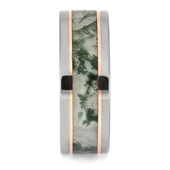 Moss Agate Wedding Band with Rose Gold Pinstripes