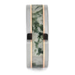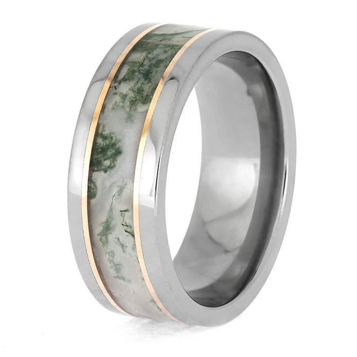 Durable titanium, polished rose gold, and colorful moss agate combine on this nature-inspired wedding band from Jewelry by Johan. The swirling patterns of the moss agate inlay are unique to every example, meaning your ring will be completely one-of-a-kind!
