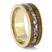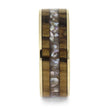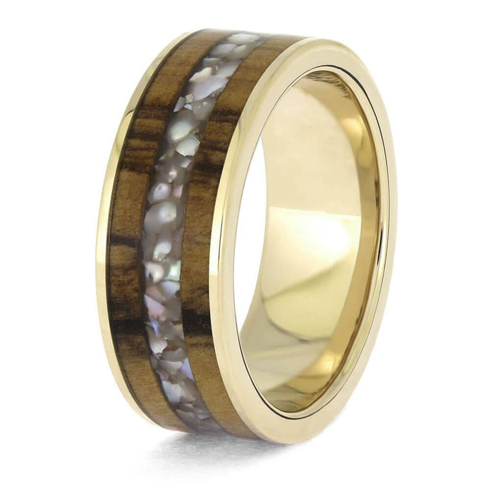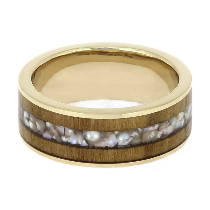This luxurious wedding band boasts a stunning blend of crushed mother of pearl and Bethlehem olive wood, showcasing the wood's distinct grain and pearl inlays that change color. The polished white gold adds to the natural and handmade aesthetic.