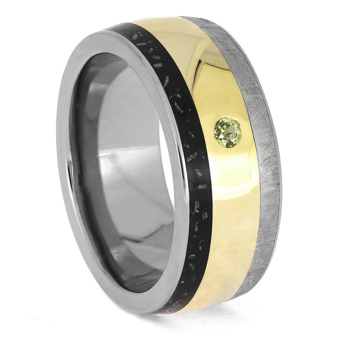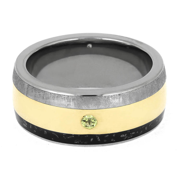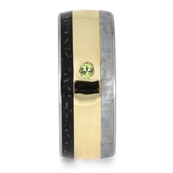 Peridot Birthstone Ring for Men with Meteorite and Yellow Gold